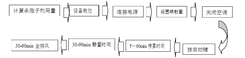 ⑸ 性價(jià)比極高,不到氣化過(guò)氧化氫設(shè)備20-30分之一的成本,達(dá)到滅菌效果 ⑹ 整個(gè)消毒過(guò)程時(shí)間短,所以相比甲醛熏蒸使停產(chǎn)時(shí)間大大縮短 滅菌流程