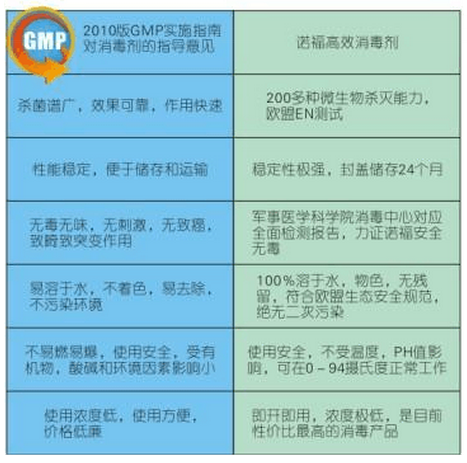 3 具備高適用性:諾福不受溫度,光照,PH值影響,這點(diǎn)幾乎克服了其他所有消毒產(chǎn)品的缺點(diǎn),我們知道目前的消毒產(chǎn)品,無(wú)一例外的會(huì)受到PH值,溫度的影響,從而失效或者需要增加用量(用量的增加,意味著腐蝕性,濃度的增加,意味著GMP車間的易清洗程度增加)
