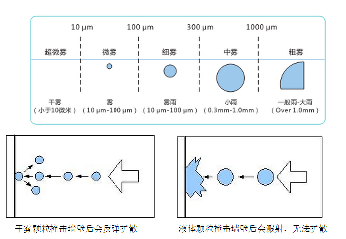 當(dāng)液滴的平均直徑小于10微米時(shí),噴出霧可以被稱作是“干”的;小的液滴會(huì)從墻面上彈開并且不會(huì)破裂附著使表面潮濕。而所有的條件的建立都是為了滿足殺孢子劑以氣化的形式有效地移動(dòng)到指定的區(qū)域,這種形式的特性決定了它們可以移動(dòng)到平時(shí)難以達(dá)到的區(qū)域。