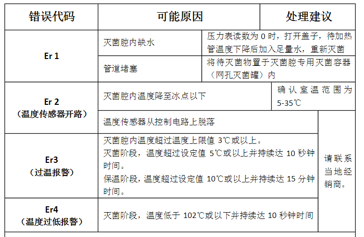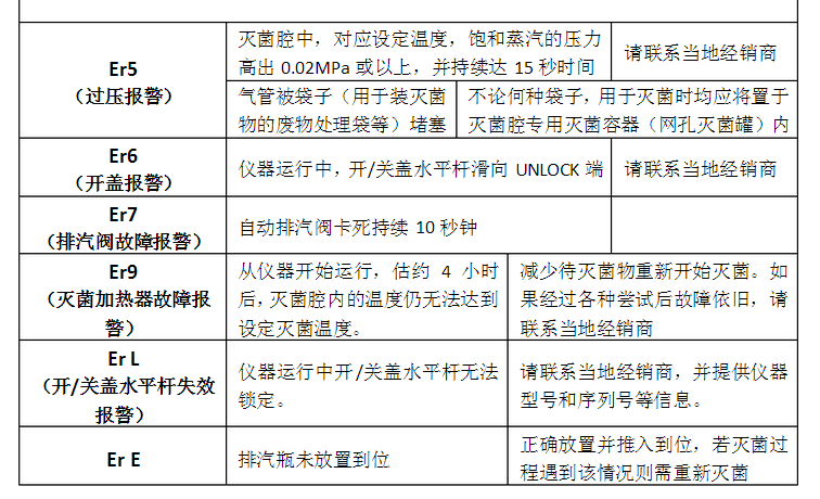 功能異常時(shí),錯(cuò)誤檢測(cè)電路將觸發(fā)以確保安全。電路激活時(shí),錯(cuò)誤代碼在顯示屏顯示并聲音報(bào)警。按START/STOP鍵可停止報(bào)警聲。報(bào)警情況發(fā)生時(shí),檢查錯(cuò)誤代碼,并關(guān)閉儀器電源。
