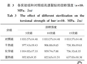 各實(shí)驗(yàn)組和對照組高速裂鉆的扭轉(zhuǎn)強(qiáng)度計(jì)算結(jié)果見表3,如表3示:和對照組相比,隨著滅菌次數(shù)的增加,干熱滅菌法、化學(xué)浸泡法和濕熱滅菌法組內(nèi)裂鉆的扭轉(zhuǎn)強(qiáng)度均逐漸減小。不同處理方法之間的比較顯示,在處理5次和10次時(shí),干熱處理、化學(xué)浸泡和濕熱處理3種處理方法之間兩兩比較,扭轉(zhuǎn)強(qiáng)度的差異均有統(tǒng)計(jì)學(xué)意義(P<0.05);在處理15次時(shí),化學(xué)浸泡和干熱處理引起的扭轉(zhuǎn)強(qiáng)度的差異無統(tǒng)計(jì)學(xué)意義,而濕熱處理組與化學(xué)浸泡和干熱處理組之間的差別均有統(tǒng)計(jì)學(xué)意義(P<0.05)。干熱滅菌法和化學(xué)浸泡法對裂鉆扭轉(zhuǎn)強(qiáng)度的影響相同且弱于濕熱滅菌法。